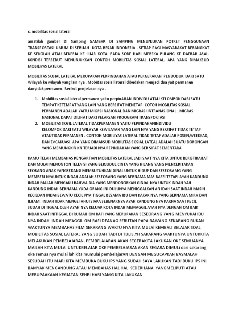 Mobilita lateral terbagi menjadi dua, yaitu: Sementara mobilitas lateral tidak permanen merujuk pada perpindahan seseorang atau kelompok ke wilayah lain yang sifatnya tidak menetap. Mobilitas sosial vertikal adalah perpindahan seseorang atau kelompok dari suatu kedudukan sosial ke kedudukan sosial lain yang tidak sederajat, baik pindah ke tingkat yang lebih tinggi (social climbing) maupun turun ke tingkat lebih rendah (social sinking). Pengertian mobilitas sosial adalah perpindahan status/posisi sosial individu atau suatu kelompok ke status/posisi lain dalam kehidupan bermasyarakat. Mobilitas seperti ini terjadi karena adanya perubahan. Dan jika sudah selesai maka mahasiswa tersebut kembali ke rumahnya. Mobilitas sosial lateral ialah peralihan orang dari sektor tempat satu ke sektor tempat yang lainnya. Kata sosial yang ada pada. Untuk meningkatkan status sosial, salah satu cara yang dilakukan manusia adalah dengan melakukan mobilitas sosial. Mobilitas horizontal (lateral) mobilitas horizontal menunjuk pada gerakan seseorang atau c. Mobilitas sosial antargenerasi, adalah mobilitas sosial yang terjadi pada dua generasi atau lebih. Dalam mobilitas sosial lateral disebut dengan mobilitas geografis. Mobilitas berasal dari bahasa latin mobilis yang berarti mudah dipindahkan atau banyak bergerak dari satu tempat ke tempat yang lain.