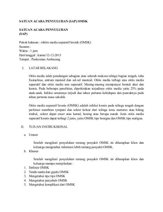 Komplikasi Otitis Media Supuratif Kronik from imgv2-1-f.scribdassets.com Otitis media supuratif kronik adalah radang kronis telinga tengah dengan adanya lubang (perforasi) pada gendang telinga (membran timpani) dan riwayat keluarnya cairan (sekret) dari telinga (otorea) lebih dari 2 bulan, baik terus menerus atau hilang timbul. Komplikasi otitis media supuratif kronis tipe bahaya mempunyai tanda dan gejala klinis yang khas.tujuan penelitian ini adalah mengetahui profil penderita otitis media. Komplikasi otitis media supuratif kronis tipe bahaya. Report from international primary care network. Acute otitis media (aom) is an ear infection common caused by bacterial or viral infection. (lebih 2 bulan) otitis media supuratip kronis otitis media serosa kronis (omsk) (glue ear). Otitis media terbagi atas otitis media supuratif dan otitis media non supuratif (= otitis media serosa, otitis media sekretoria, otitis media musinosa, otitis media efusi/ome). Secara global, otitis media merupakan penyakit telinga yang lebih banyak dialami pria daripada wanita otitis media supuratif kronis.