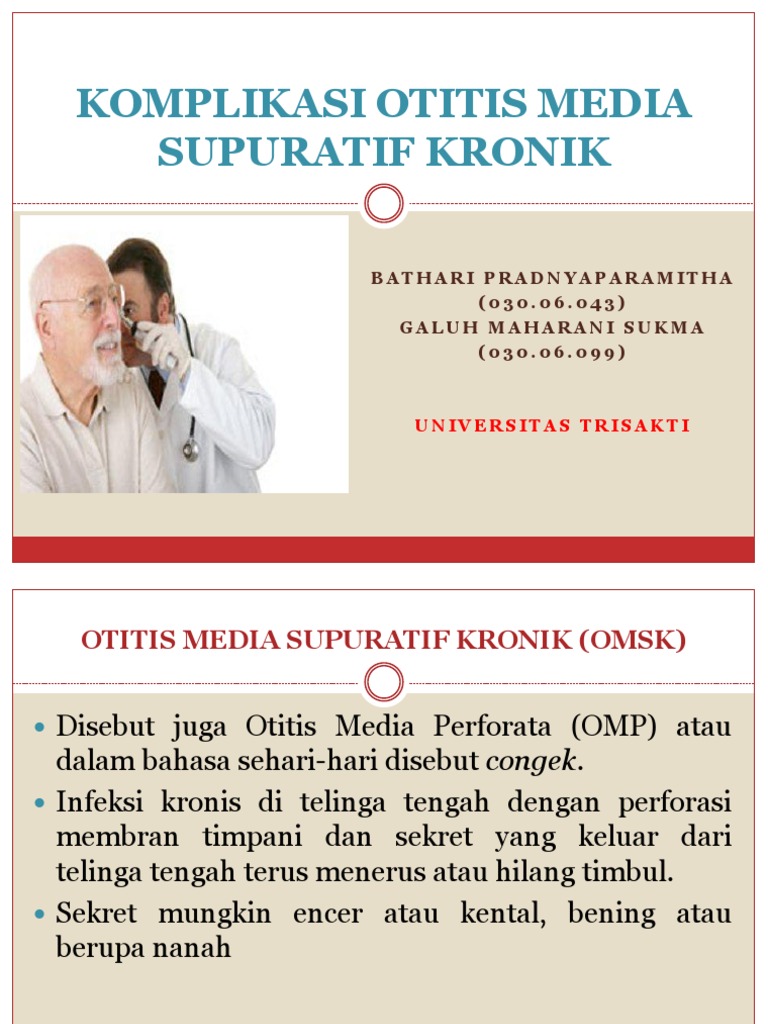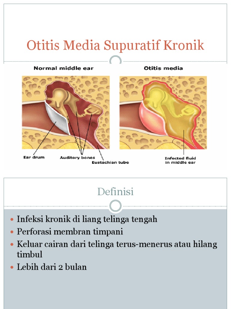 Penyakit Otitis Media Supuratif Kronik : Otitis media terbagi atas otitis media supuratif dan otitis media non supuratif (= otitis media serosa, otitis media sekretoria, otitis media musinosa, otitis media efusi/ome).. (lebih 2 bulan) otitis media supuratip kronis otitis media serosa kronis (omsk) (glue ear). Simak informasi lengkapnya seputar omsk di sini. Patofisiologi otitis media terjadi karena adanya disfungsi tuba eustachius (te). Chronic suppuration can occur with or without cholesteatoma, and the clinical history of both conditions can be very similar. Acute otitis media (aom) is an ear infection common caused by bacterial or viral infection.
