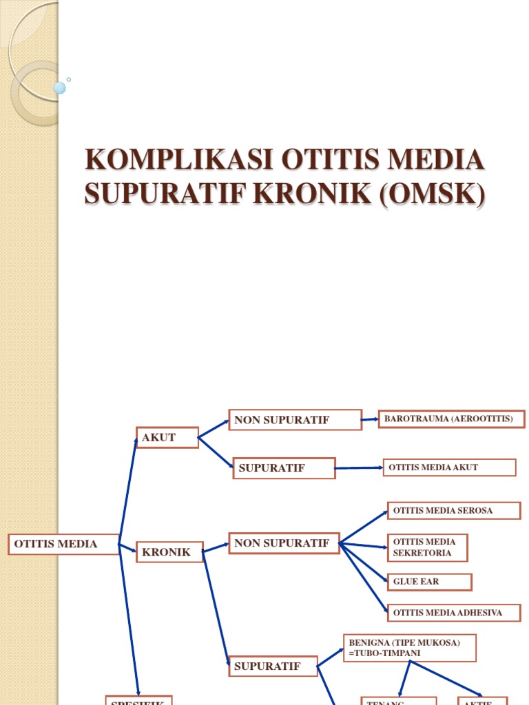 Penyakit Otitis Media Supuratif Kronik : Otitis media terbagi atas otitis media supuratif dan otitis media non supuratif (= otitis media serosa, otitis media sekretoria, otitis media musinosa, otitis media efusi/ome).