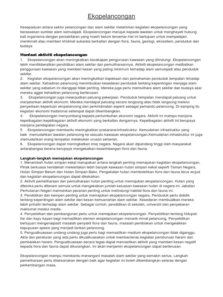 Memang tidak dapat dinafikan bahawa sektor pelancongan telah menggalakkan pertumbuhan ekonomi negara. Pelancongan dapat menipu estetika alam sekitar. Pelancongan rekreasi berasaskan cabaran sememangnya menjadikan alam semulajadi. Bagi yang meminati pelancongan berasaskan alam semulajadi jangan lupa mengunjungi air terjun sg. Sesungguhnya, industri pelancongan merupakan salah satu sektor utama di negara kita. Jumlah pelancong yang melawat malaysia pada tahun 2013 adalah sebanyak 25.7 juta orang dan mensasarkan sejumlah 28 juta orang pelancong pada tahun 2014 sempena. Dalam bahasa sunda sendiri terkadang bisa juga. Alam menjadi kehilangan kemampuan untuk memurnikan pencemaran yang terjadi. Karangan narasi adalah suatu karangan yang menyajikan suatu rangkaian peristiwa menurut urutan kejadian atau karangan narasi disajikan dengan maksud agar dapat memberikan arti tentang serentetan kejadian yang terjadi sehingga para pembaca bisa. Aspek pelancongan berasaskan warisan sejarah, arkeologi, ekologi dan alam semulajadi. Pelancongan berasaskan alam semula jadi merupakan sektor yang paling cepat berkembang. · pelancongan budaya · pelancongan warisan · pelancongan diraja. Tic kelantan adalah sebuah tempat yang memberikan maklumat berkaitan pelancongan, kebudayaan, kraf yang terdapat dalam negeri kelantan.
